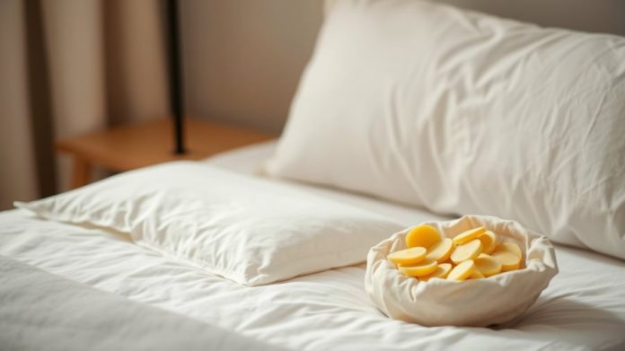 2. Đặt gừng gần gối: Bỏ gừng vào một chiếc túi vải nhỏ hoặc đặt trong một chiếc bát nhỏ, sau đó đặt gần gối của bạn. Nếu muốn hương thơm lan tỏa mạnh hơn, bạn có thể cắt gừng thành lát mỏng.